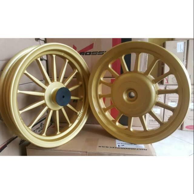 Solusi itu adalah pelek V-Rossi ring 12 dengan desain palang lurus dengan warna emas yang mewah. Jakarta Barat - Jakarta. Velg Motor memang selalu menggoda kalian untuk merancang tampilan interior maupun eksterior kendaraan sesuai dengan karakter dan ragam gaya yang diminati.